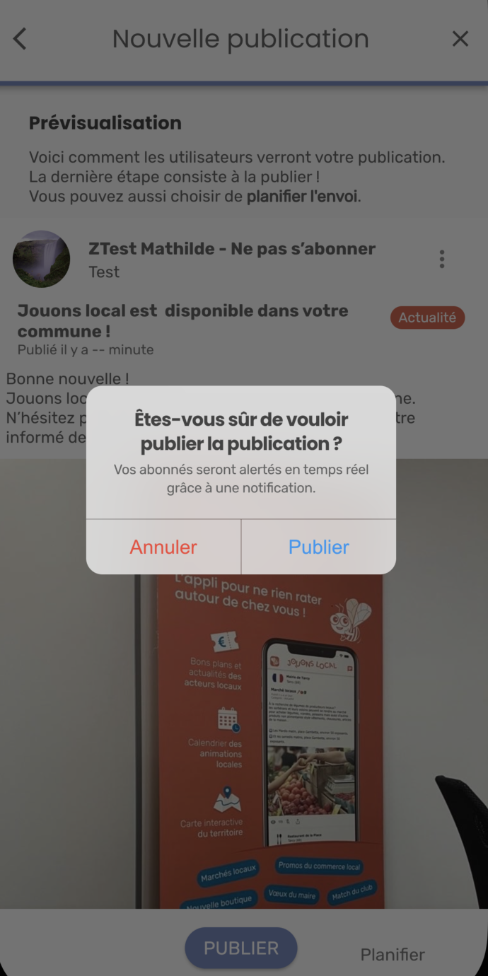 apparaît pour vous demandez si vous êtes sûr de vouloir publier la publication.