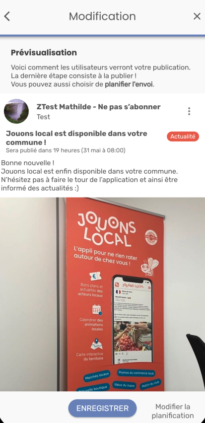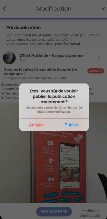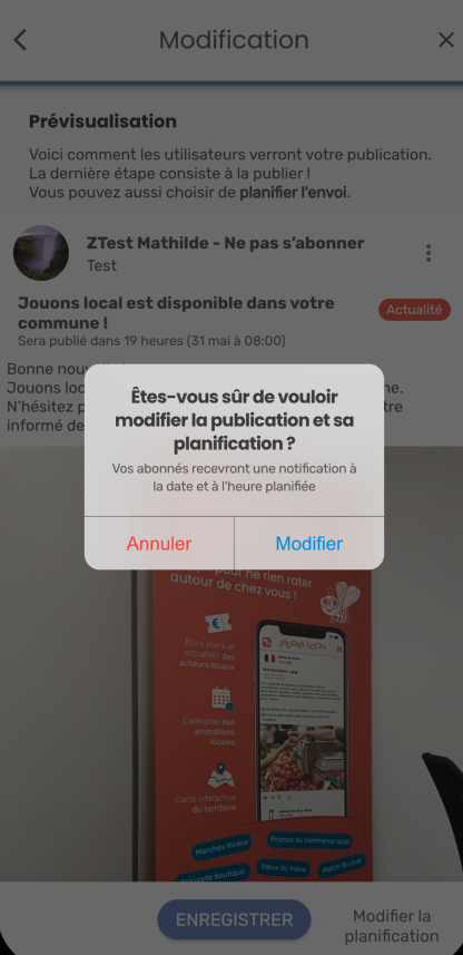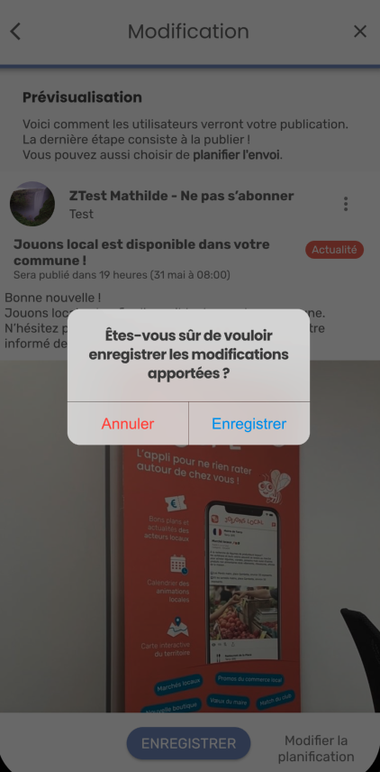 Attention ! La date que vous aviez planifiée n’est pas conservée, si vous cliquez sur ENREGISTRER, la publication sera publiée. Pensez à saisir une nouvelle date de planification si vous souhaitez différer la publication.
