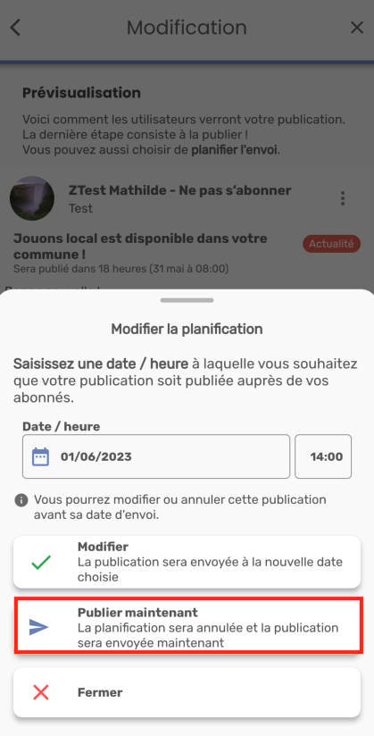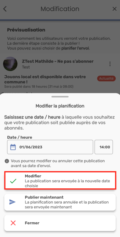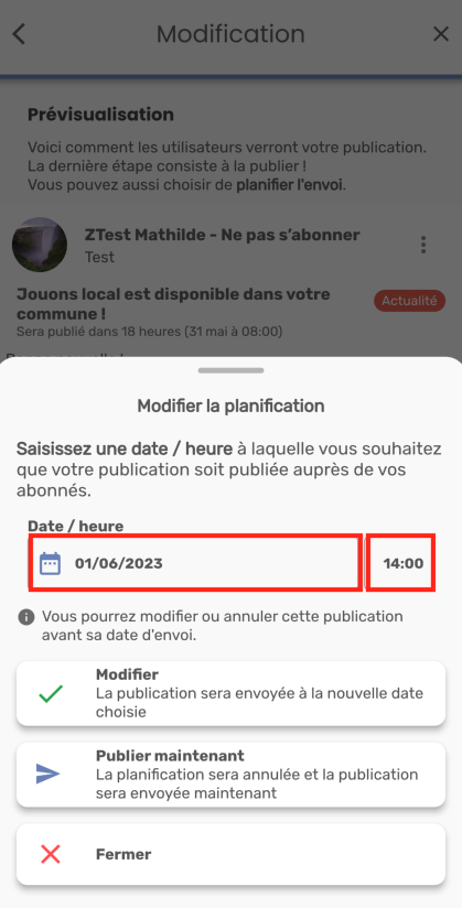 Sur l'écran de prévisualisation, si vous cliquez sur “Modifier la planification”, une fenêtre s’affiche et vous demande de saisir une nouvelle date/heure de planification.